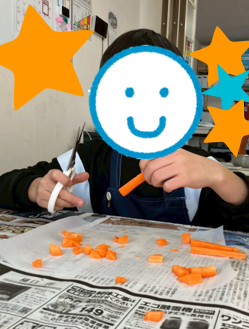 キッチンバサミでは、初めはカットした人参が勢いよく飛んでいましたが少しずつ飛ばさないよう力加減を調節しながらカットすることが出来ていました(*^^)v