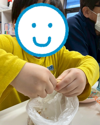 初めは卵割のように机にコンコンしたり、手のひらで挟んで力を入れてみたりと中の豆を取り出そうと色々と試してみる子どもたち( *´艸`)